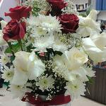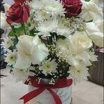 5 red rose 5 white spray rose 1 stem white chrysanthemum 3 stem white gibson 3 single ruscus Round box Fabric Red ribbon