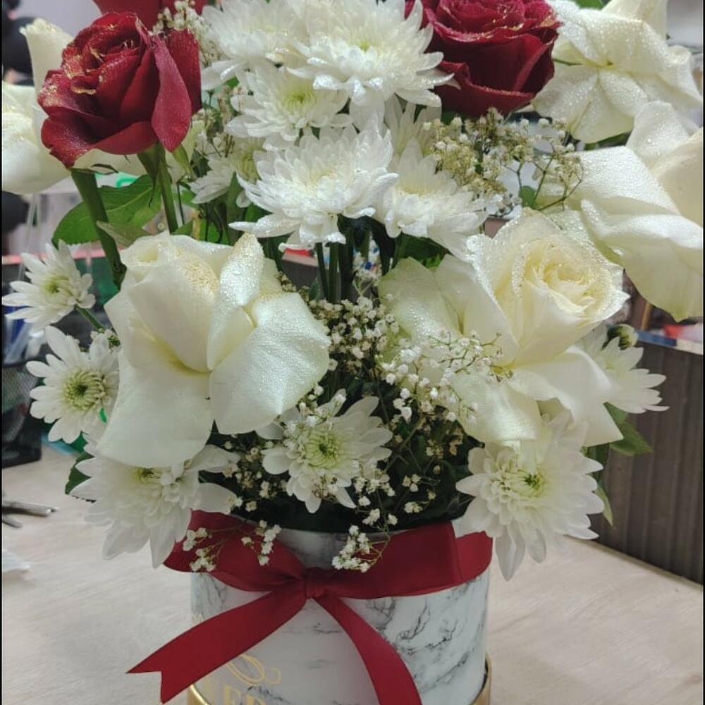 white chrysanthemum - 1 pcs red roses - 5 pcs white spray roses - 5 pcs fabric red ribbon - 1 pcs white gibson (gypsophila) - 3 pcs ruscus (greenery) - 3 pcs round box base - 1 pcs