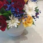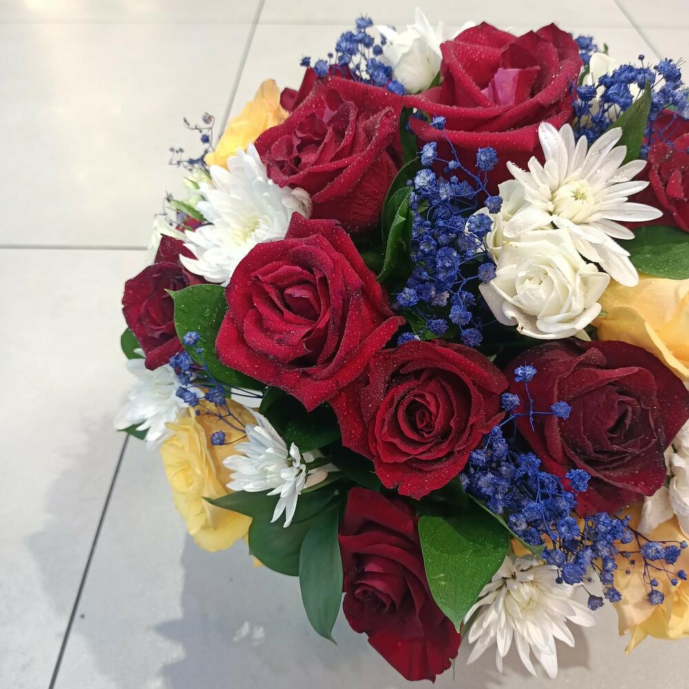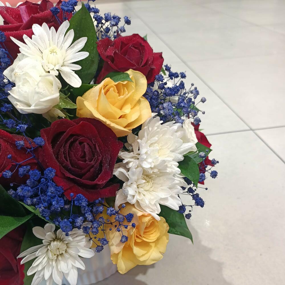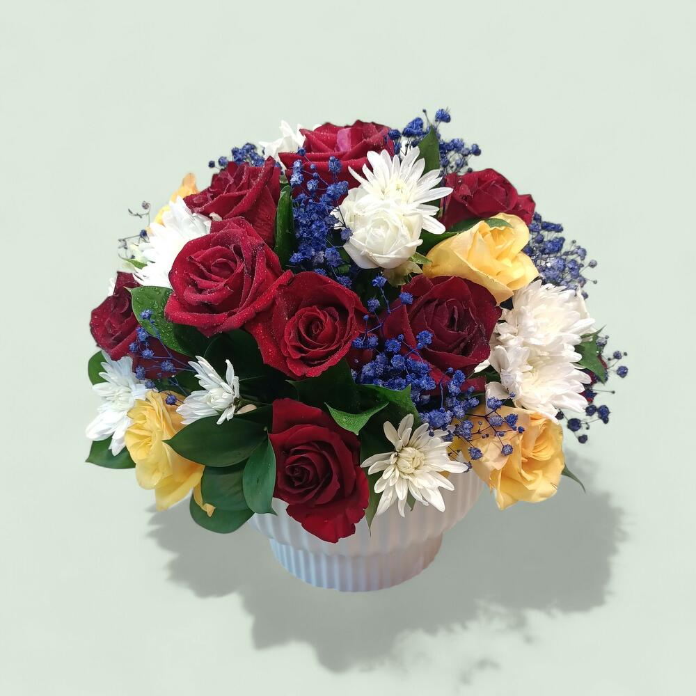 A vibrant and cheerful floral arrangement housed in a classic white fluted bowl, bursting with a colorful mix of rich red roses, sunny yellow roses, crisp white chrysanthemums, and unique blue-tinted babys breath. Each bloom is fresh and dew-kissed, making this an ideal centerpiece for a festive occasion or a bright addition to any space.