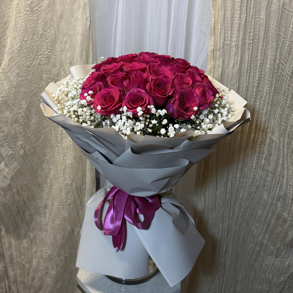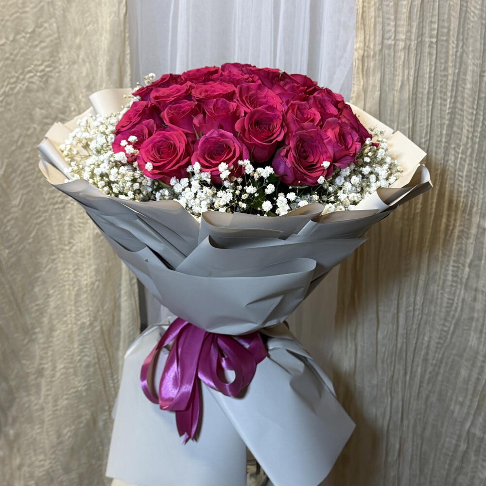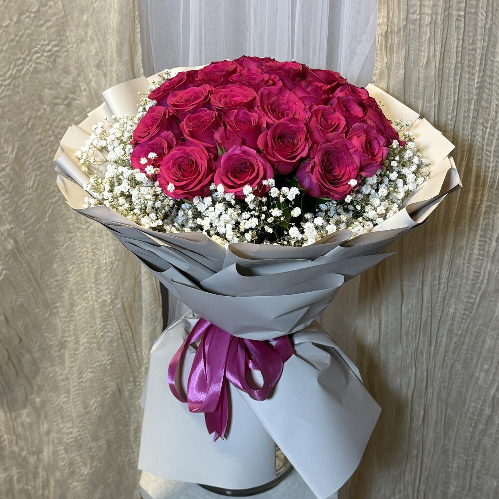 Experience a burst of vibrancy with our Mono Bouquet, artfully composed of 20 radiant Fuschia roses. It is beautifully balanced with the delicacy of 6 sprigs of Gypsophila, offering an elegant contrast that adds a touch of whimsy to the composition. A testimony to classic charm and modern flair, this bouquet is an ideal choice to elicit awe-inspiring moments.