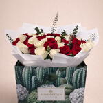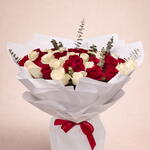 Green leaves - 5 pcs red roses - 26 pcs white roses - 25 pcs