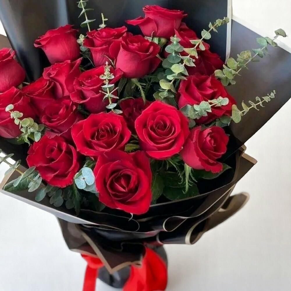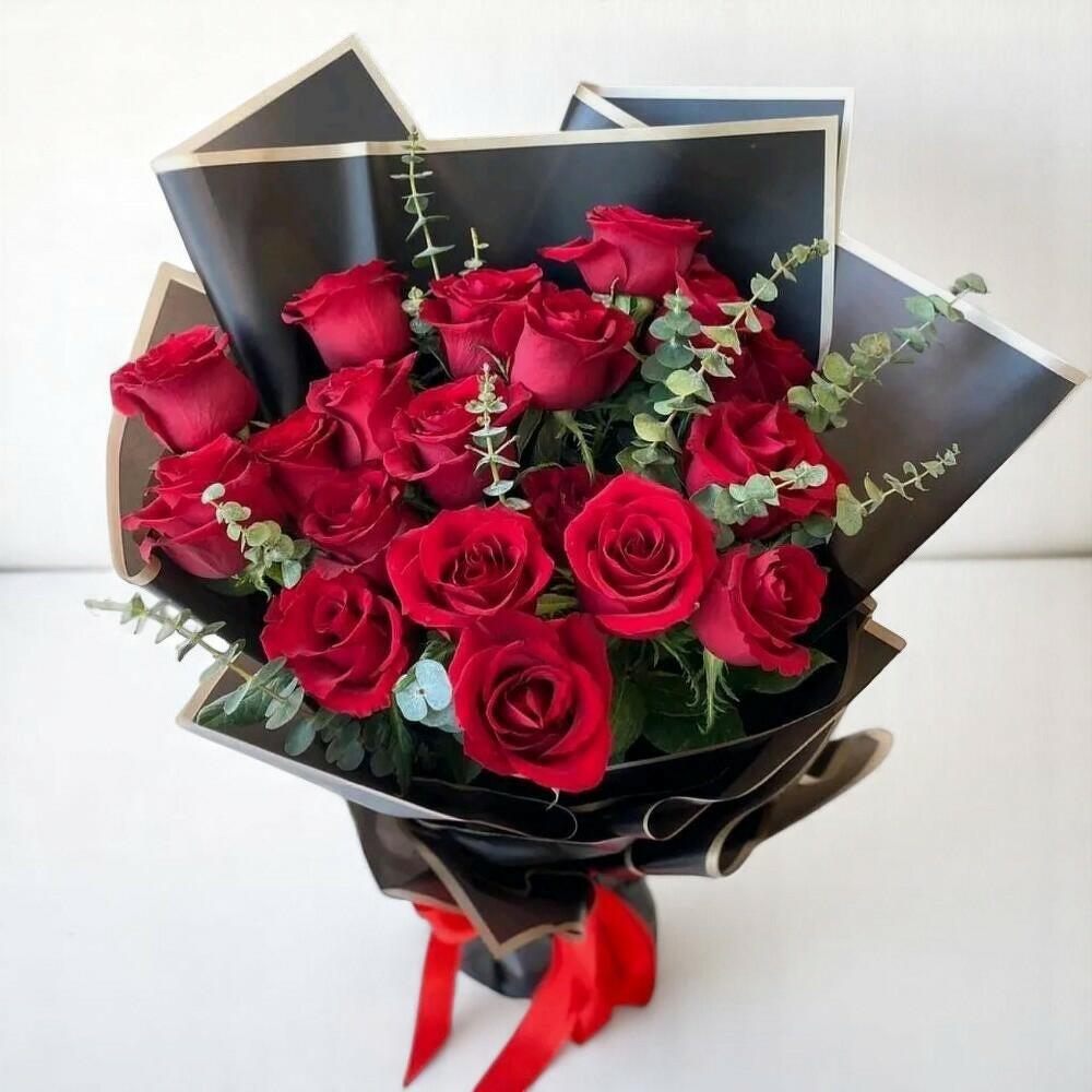 Classic elegance meets passionate romance in this stunning bouquet of vibrant red roses, beautifully arranged with sprigs of fresh eucalyptus. The black wrapping with a gold-edged finish adds a luxurious touch, making it a perfect gift for anniversaries, Valentines Day, or heartfelt declarations of love. Its bold color palette and refined style are sure to make a lasting impression. To prolong freshness, trim the stems every two days, keep the bouquet in cool water, and place it away from direct sunlight and heat sources.