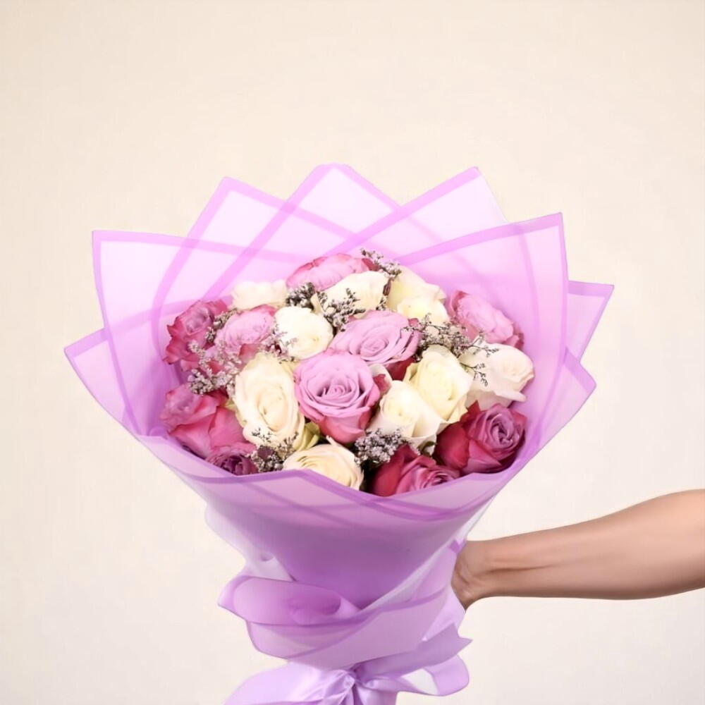 Romantic and graceful, this charming bouquet of roses in soft shades of lavender, pink, and creamy white is the perfect expression of elegance and tenderness. Wrapped in stylish lilac film and finished with a matching satin bow, this bouquet is ideal for anniversaries, birthdays, Valentine’s Day, or simply to brighten someone’s day. The harmonious blend of gentle tones creates a bouquet that is both timeless and full of emotion. To keep the bouquet fresh and beautiful, place it in clean, cool water and trim the stems diagonally every 2–3 days. Keep away from direct sunlight, heat sources, and cold drafts. Change the water regularly and remove any fading blooms to maintain its refined and romantic look.