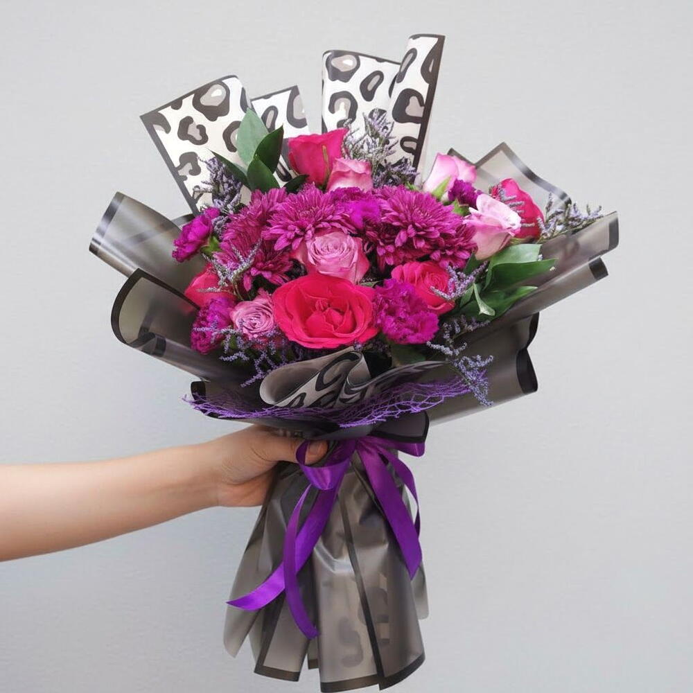 This stunning bouquet dazzles with rich pink and fuchsia shades, creating a bold and romantic composition. Perfect for birthdays, anniversaries, Valentine’s Day, romantic surprises, or congratulating someone on a personal achievement, it instantly brings warmth and emotion to any moment. Lush roses pair beautifully with vibrant chrysanthemums and delicate fillers, giving the arrangement depth and expressive charm. Elegant greenery adds freshness, while the stylish wrapping with a chic print enhances its modern, sophisticated look. Place the bouquet in clean, cool water as soon as possible to maintain its vivid colors. Trim the stems by 1–2 cm daily and keep the flowers away from heat sources or direct sunlight. With proper care, this bouquet will stay fresh and delightful for many days.