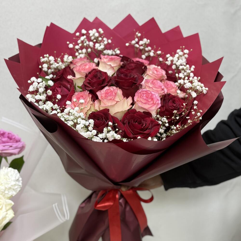 Red rose - 10 pcs gypsophila white - 3 pcs jumiliya rose - 10 pcs