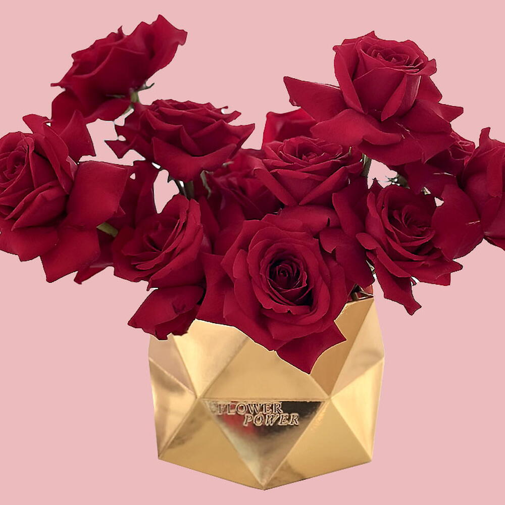 A bold and luxurious arrangement of long-stemmed red roses, presented in a dramatic crimson geometric vase. This design is a timeless symbol of passion, deep affection, and elegance—a striking statement perfect for anniversaries, grand gestures of love, or significant celebrations. Small size - 10 Red Roses