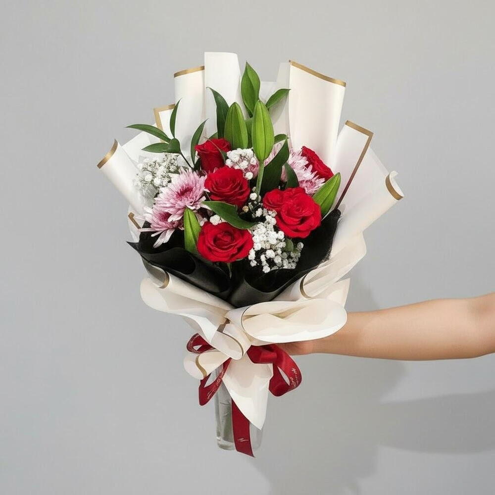 This graceful bouquet is a perfect blend of passionate red roses, soft pink chrysanthemums, and delicate baby’s breath, enhanced by lush green foliage. The chic wrapping in black and white with gold accents adds an air of sophistication, making it an ideal gift for romantic occasions, birthdays, or special celebrations. Place the bouquet in a clean vase with fresh water. Change the water every two days and trim the stems at an angle for better hydration. Avoid placing the bouquet in direct sunlight or near heating sources. Lightly mist the flowers to maintain their freshness and beauty.
