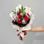 Red rose - 5 pcs Chrysanthemum - 2 pcs baby's breath - 2 pcs white lilly - 2 pcs