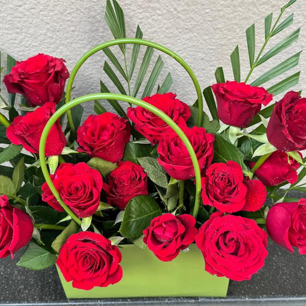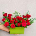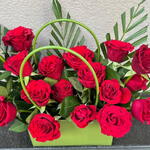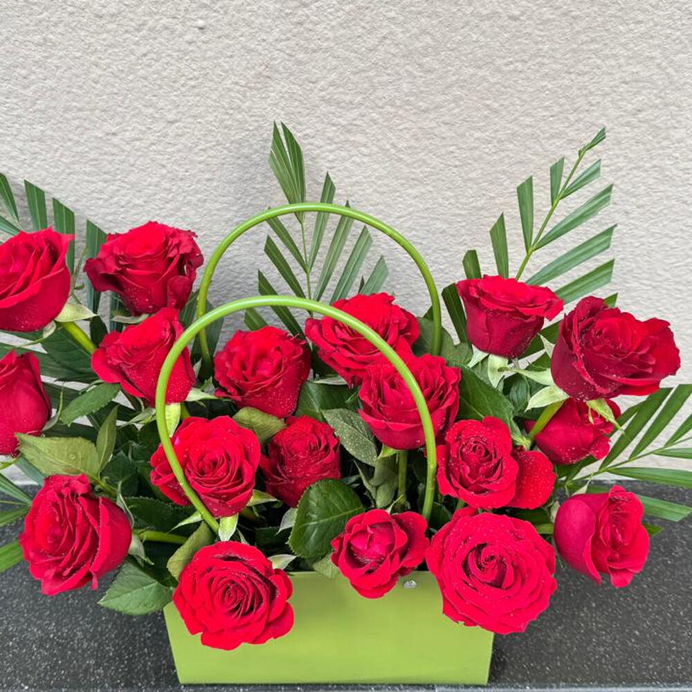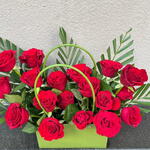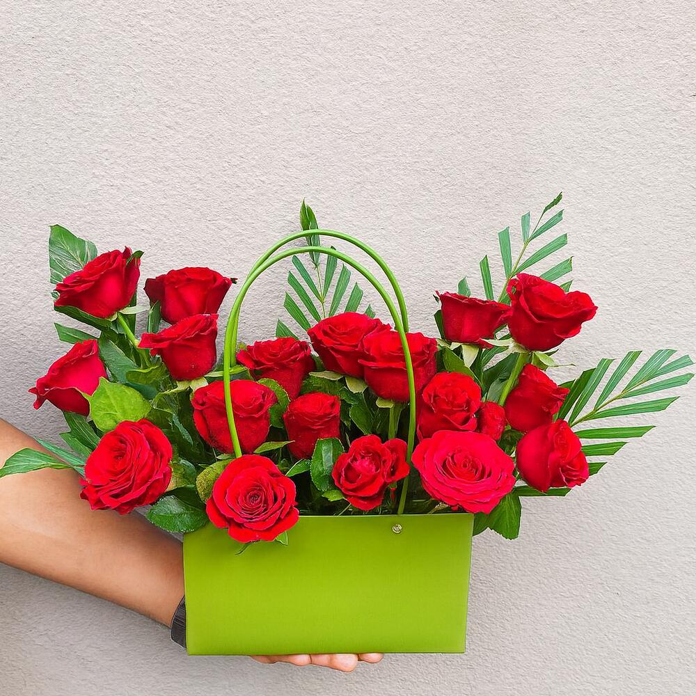 Romance in a bag;25 stems of red roses in a bag Indulge in the mesmerizing beauty of our Florists Special arrangement. Comprised of 25 luxuriously ripe red roses, fringed beautifully by 4 exotic Areca palm leaves. This arrangement effortlessly captivates with its rich glow and refreshing green accents, making it a perfect gift for special occasions or simply to brighten up any space.