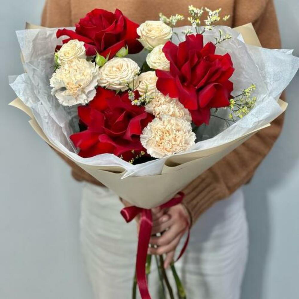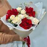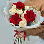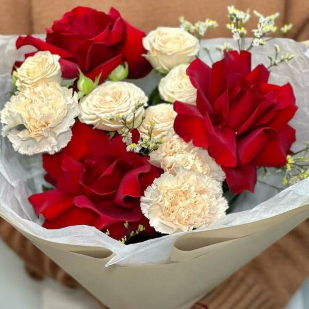 Red rose - 3 pcs Spray rose - 1 pcs Wrapping - 1 pcs carnation - 3 pcs limonium white - 1 pcs