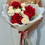 Experience the timeless romance of our elegant bouquet, featuring a captivating blend of deep red roses and delicate cream carnations. This classic combination symbolizes deep love and admiration, making it the perfect gift for anniversaries, Valentines Day, or simply to express your heartfelt emotions. The lush, velvety petals of the red roses contrast beautifully with the soft, ruffled carnations, creating a stunning visual harmony. Wrapped in premium tissue paper and finished with a satin ribbon, this bouquet is a true statement of love and elegance. Show your loved one how much they mean to you with this unforgettable floral arrangement.
