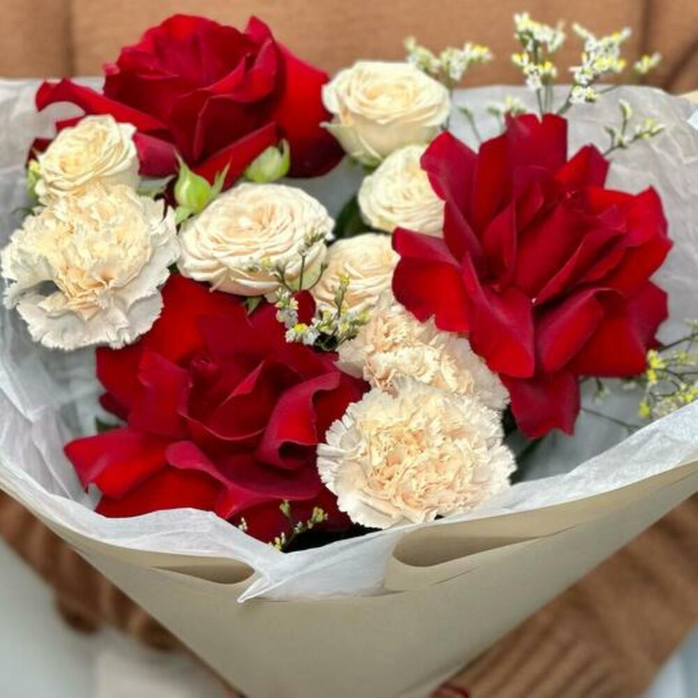 Experience the timeless romance of our elegant bouquet, featuring a captivating blend of deep red roses and delicate cream carnations. This classic combination symbolizes deep love and admiration, making it the perfect gift for anniversaries, Valentines Day, or simply to express your heartfelt emotions. The lush, velvety petals of the red roses contrast beautifully with the soft, ruffled carnations, creating a stunning visual harmony. Wrapped in premium tissue paper and finished with a satin ribbon, this bouquet is a true statement of love and elegance. Show your loved one how much they mean to you with this unforgettable floral arrangement.