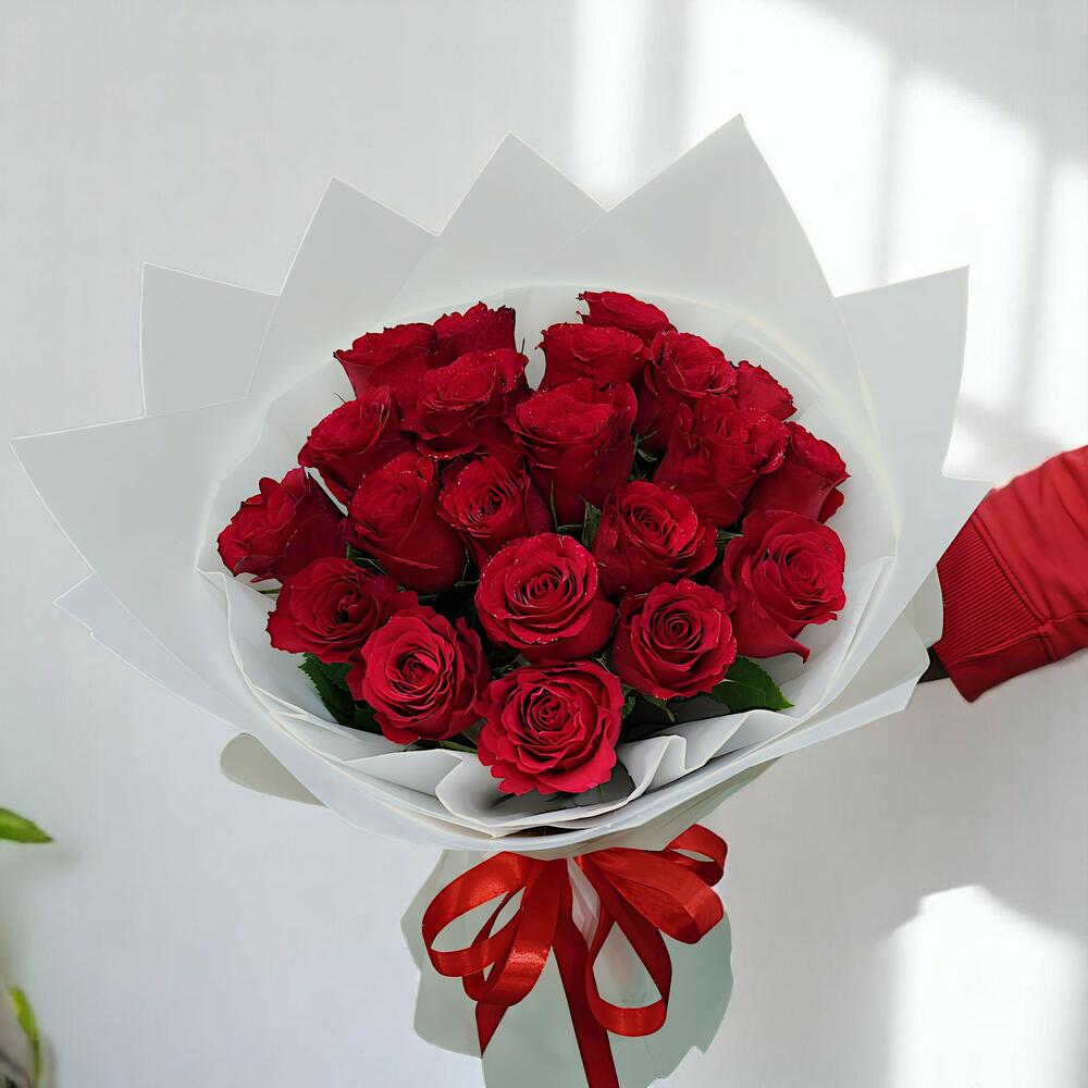 Elegant and timeless, this stunning bouquet of red roses wrapped in vibrant white paper is a perfect gesture of love and admiration. 🌹✨