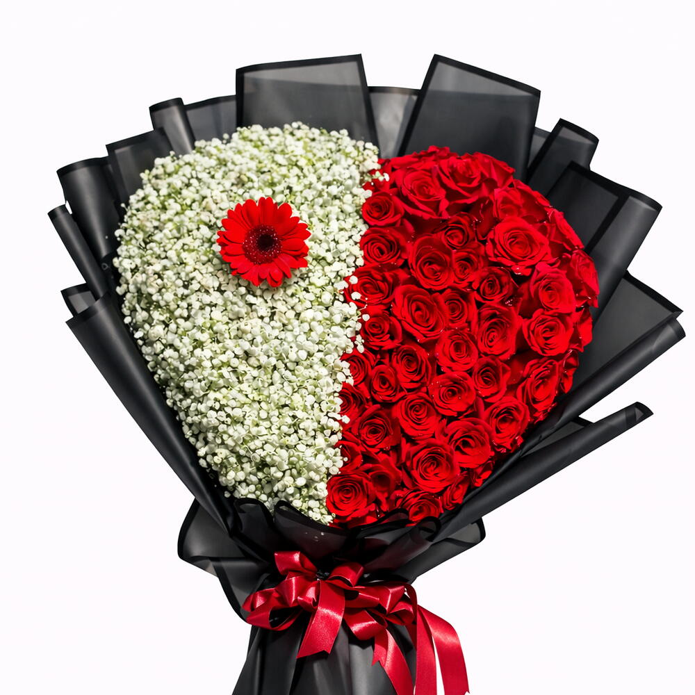Make a bold romantic statement with this stunning Heart-Shaped Red Roses Baby’s Breath Bouquet, a luxurious floral design created to symbolize deep love and devotion. This unique bouquet features two beautiful halves arranged into a heart shape: • One side filled with 31 stems of premium red roses, representing passion and romance. • The other side crafted with delicate white baby’s breath (gypsophila) symbolizing purity and everlasting love. A single red gerbera accent in the center adds a charming touch, making this bouquet even more eye-catching and meaningful. Wrapped in elegant black designer paper and finished with a satin ribbon, this bouquet delivers a powerful romantic expression perfect for unforgettable moments.