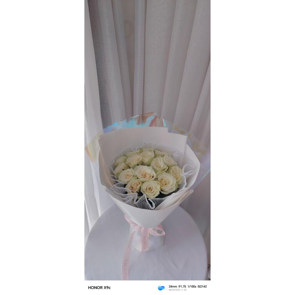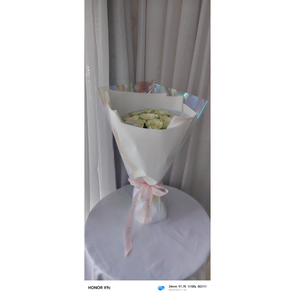 White rose - 15 pcs white wrapping paper - 6 pcs white fabric - 2 pcs