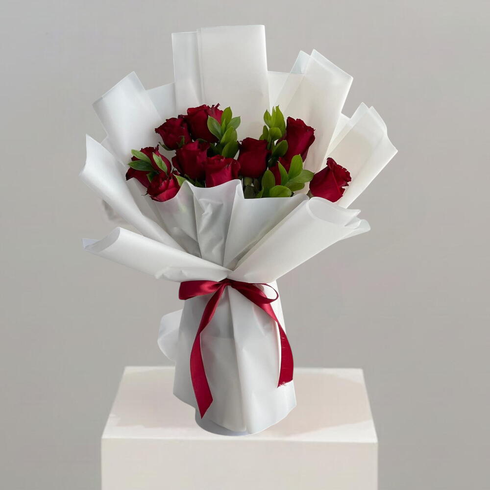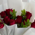 The bouquet features several full-bloomed red roses nestled among sprigs of green eucalyptus or similar filler foliage.