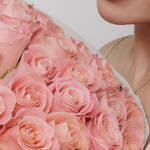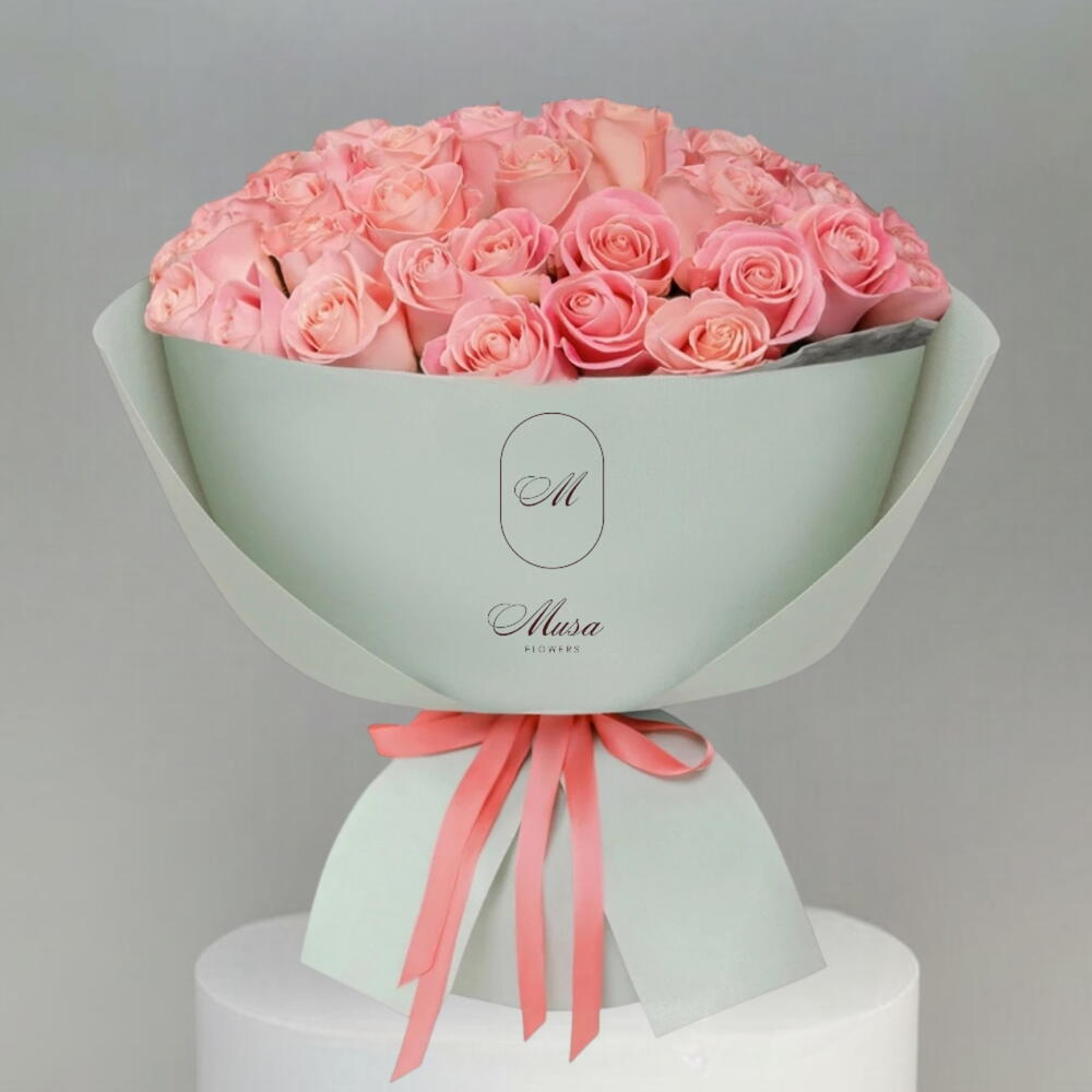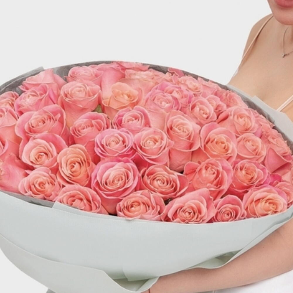 The bouquet features numerous fresh, light pink roses, possibly around 79 stems, known for their delicate petals and soft hue. Pink roses often symbolize admiration, gratitude, and joy.