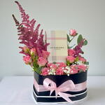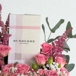 Ribbon - 1 pcs pink spray rose - 3 pcs seasonal fillers - 5 pcs black heart shaped box - 1 pcs astel b - 3 pcs burberry london (w) edp 100ml perfume - 1 pcs