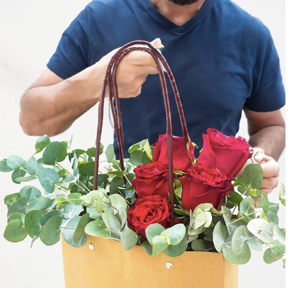 A kraft paper bag bursting with fresh red roses and eucalyptus leaves