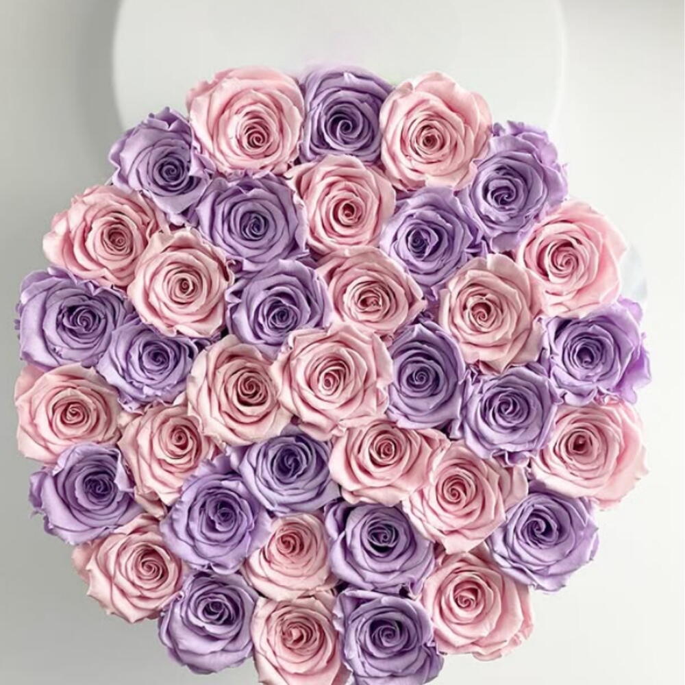 Celebrate elegance and romance with this stunning bouquet of 20 purple roses and 30 pink roses, beautifully arranged in a round box for a luxurious and sophisticated presentation. Each rose is hand-selected for freshness and premium quality, creating a perfect floral gift for your loved ones. Why You’ll Love It: Fresh and handpicked: 20 purple roses paired with 30 pink roses for a vibrant, eye-catching arrangement Elegant presentation: Luxury round box with a chic, modern design Perfect gift for: Girlfriend, wife, mother, or someone special Ideal occasions: Anniversaries, birthdays, Valentine’s Day, romantic surprises, luxury gifting, or special celebrations Care Tips: Keep in a cool, shaded place Refresh water or floral foam daily to maintain freshness Enjoy up to 7 days of vibrant, flawless blooms Enhance Your Gift: Pair this luxury purple pink roses round box with premium chocolates, balloons, or a vase to make your gesture unforgettable.