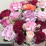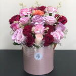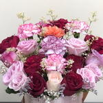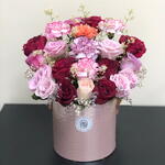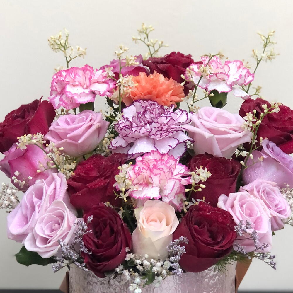 Red rose - 8 pcs Pink rose - 7 pcs purple rose - 4 pcs white limonium - 5 pcs carnation mix - 4 pcs rose gold box - 1 pcs