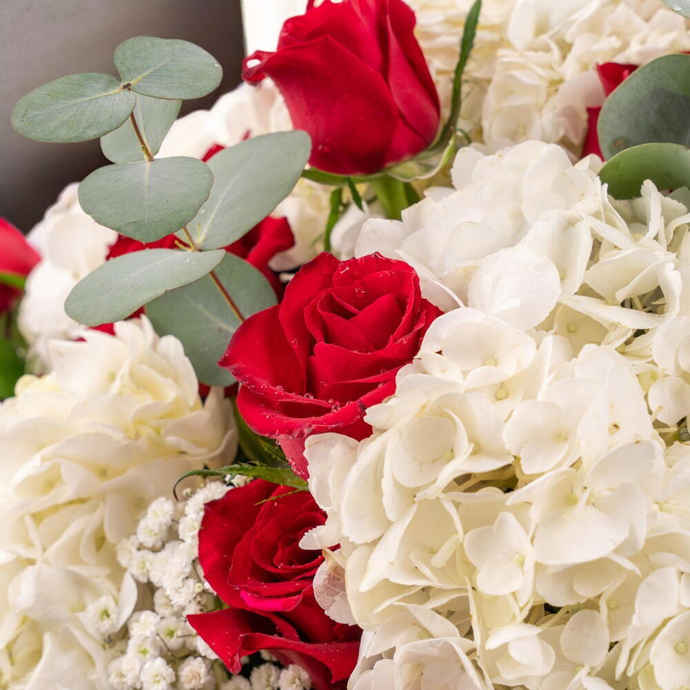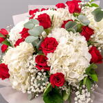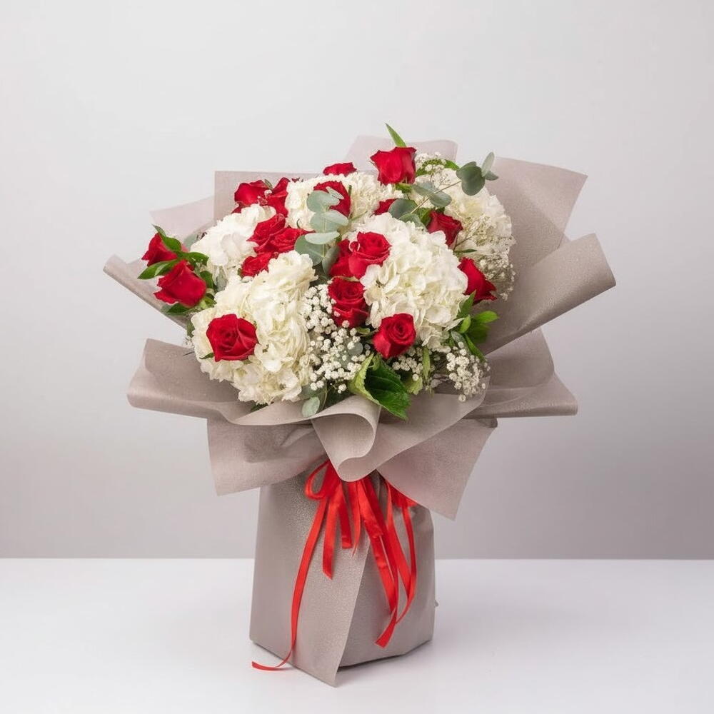 Make a statement with this luxurious bouquet of 21 red roses and 5 white hydrangeas. Wrapped elegantly with paper and ribbon, this arrangement is perfect for expressing love and admiration on any occasion.