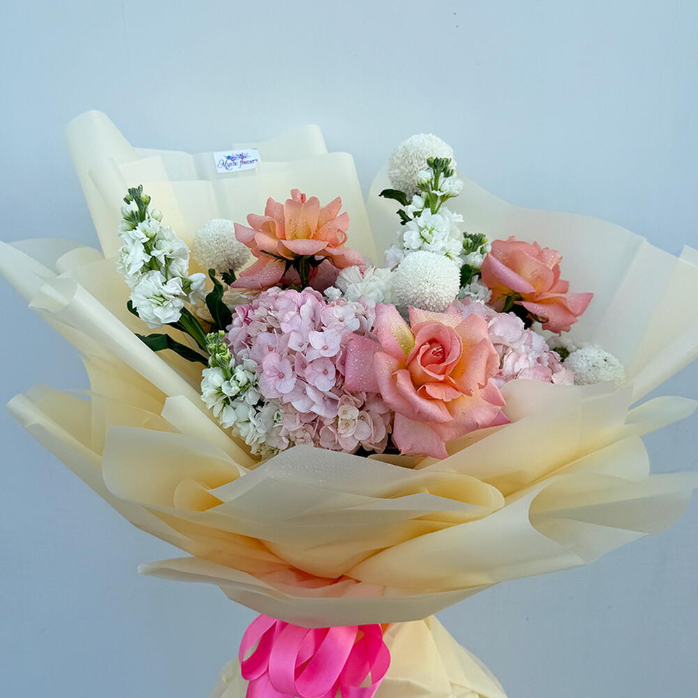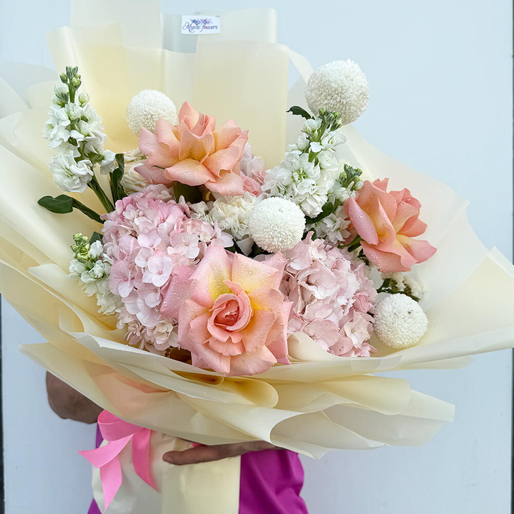 Soft, luxurious, and beautifully romantic — Rose Luxe is a dreamy pastel color bouquet made to impress from the very first glance. Wrapped in elegant cream-toned paper and finished with a bright ribbon, this fresh flowers bouquet features premium peach roses (classic roses) paired with fluffy pink hydrangea, round white ping pong chrysanthemums (pom-pom mums), and graceful white stock stems for height and fragrance. The result is a delicate mixed flowers bouquet that feels airy, feminine, and truly premium. Perfect as a Birthday Bouquet and one of the best birthday bouquet choices, Rose Luxe is ideal for birthday flowers, flowers for birthday, and thoughtful birthday gifts in Dubai. Its soft tones also make it one of the best flowers for anniversary, a gorgeous wedding flower bouquet / wedding flowers arrangement, and an elegant congratulations bouquet for new beginnings (new job, graduation, newborn). If you’re looking for a premium flowers bouquet with premium quality flowers and a trending, unique flowers bouquet style, Rose Luxe is a standout choice and a favourite for the best bouquet in Dubai.