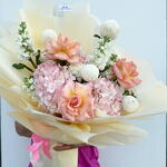 Hydrangea - 3 pcs ping pong - 4 pcs mathiola white - 3 pcs roses pink - 3 pcs