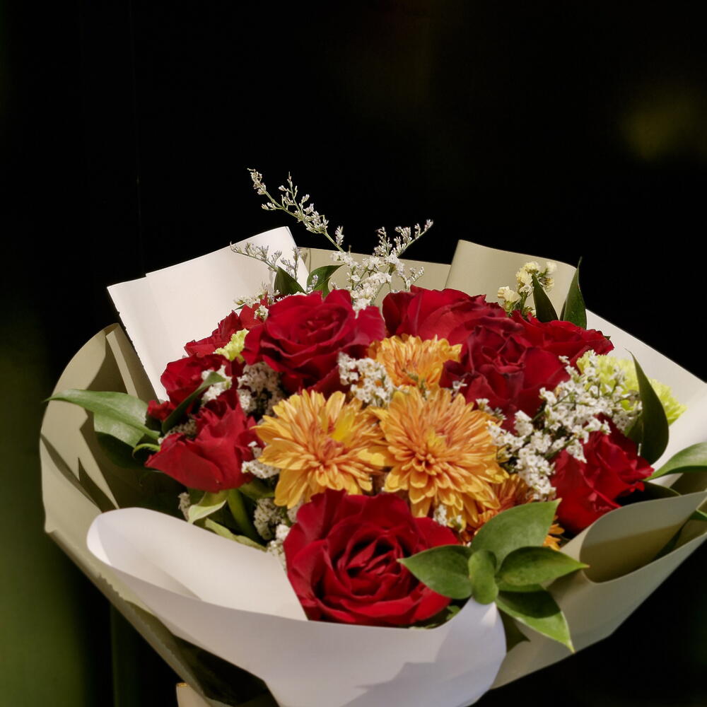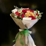 Red rose - 10 pcs ruscus leaves - 5 pcs carnation green - 2 pcs startis - 1 pcs carnation orange stem - 2 pcs