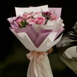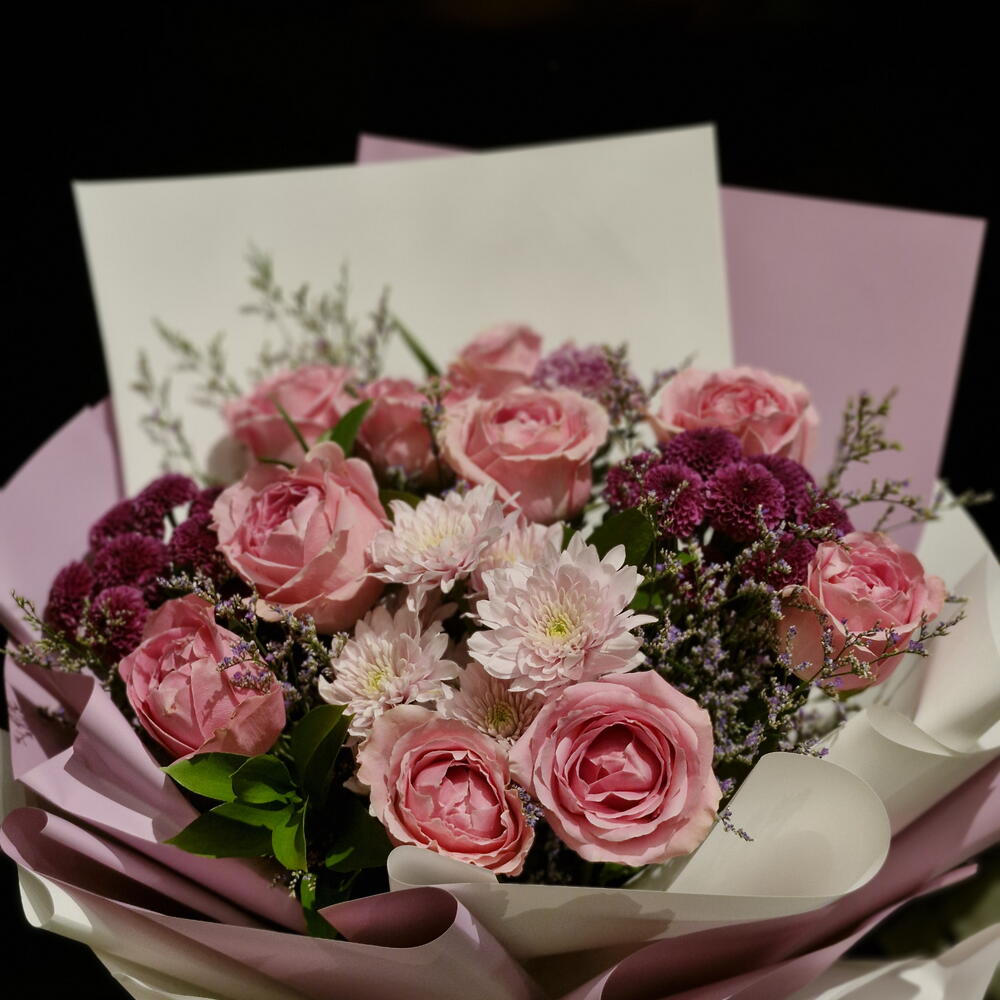Statice - 5 pcs carnation pink - 1 pcs limonium purple - 5 pcs ping pong purple - 2 pcs pink roses stem - 10 pcs
