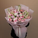 pink o'hara - 5 pcs carnation white - 3 pcs carnation pink - 3 pcs wrapping paper - 6 pcs delphinium white - 6 pcs blushing bride - 2 pcs ping pong pink - 5 pcs ranachulus pink - 5 pcs