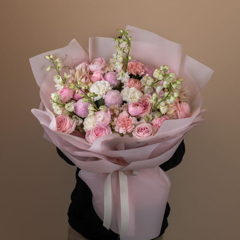 pink o'hara - 5 pcs carnation white - 3 pcs carnation pink - 3 pcs wrapping paper - 6 pcs delphinium white - 6 pcs blushing bride - 2 pcs ping pong pink - 5 pcs ranachulus pink - 5 pcs