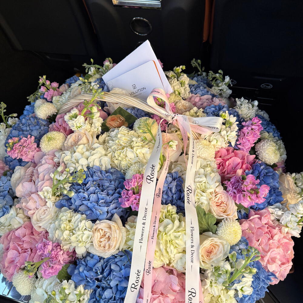 hydrangea white - 35 pcs hydrangea blue - 33 pcs ohara white - 25 pcs matiola pink - 15 pcs pingpong white - 15 pcs hydrengea pink - 25 pcs matiola white - 15 pcs