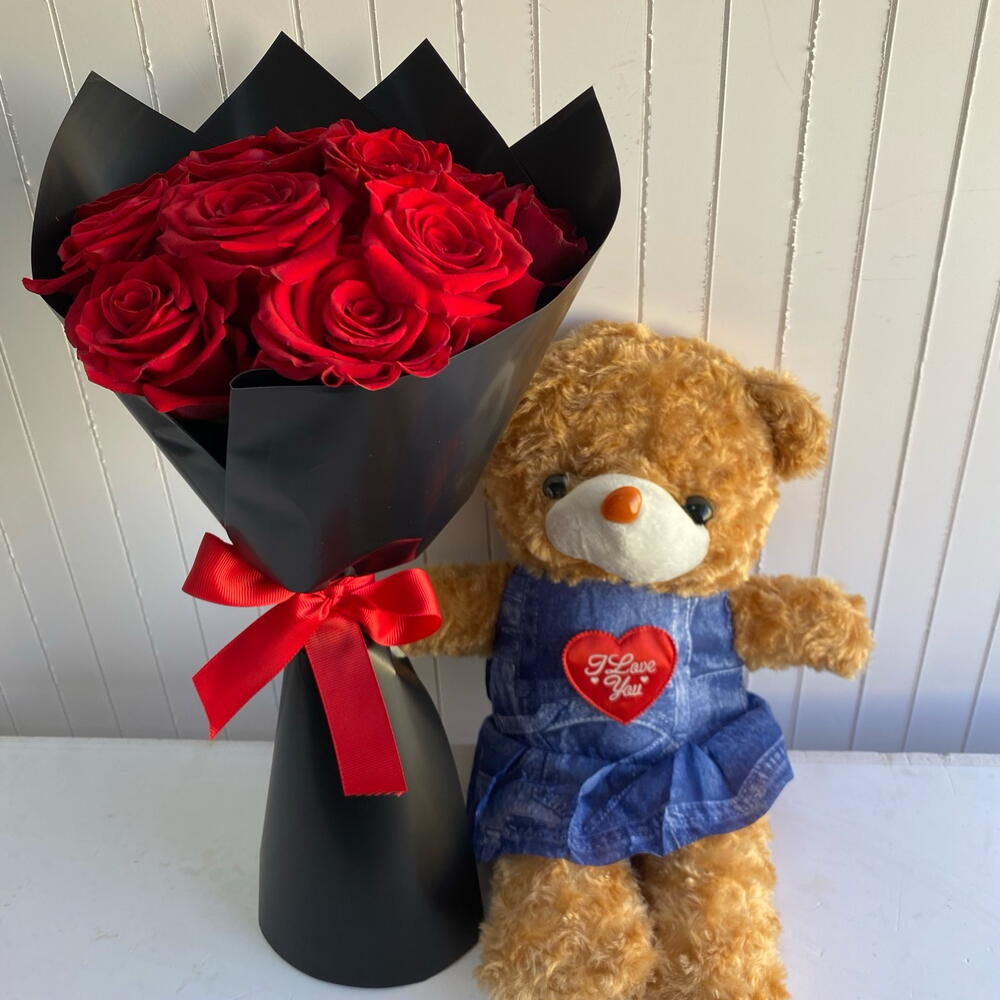 Red rose - 12 pcs Bear - 1 pcs