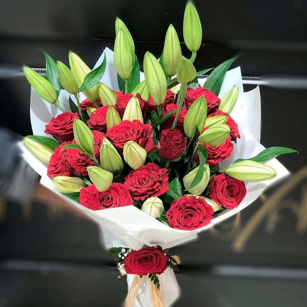 This luxurious bouquet elegantly blends the timeless beauty of deep red roses with the graceful buds of white lilies, symbolizing passion and purity in perfect harmony. Wrapped in crisp white paper and tied with a rustic raffia ribbon, this bouquet is an ideal gift for romantic gestures, anniversaries, or grand celebrations. The vibrant red roses convey deep affection, while the lily buds promise to bloom beautifully, adding an evolving charm. To keep the bouquet fresh longer, trim the stems diagonally, change the water every two days, and place in a cool area away from direct sunlight and ripening fruit.