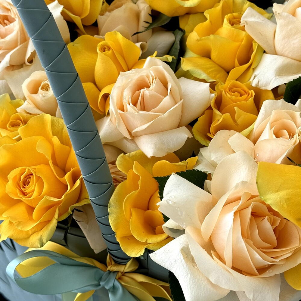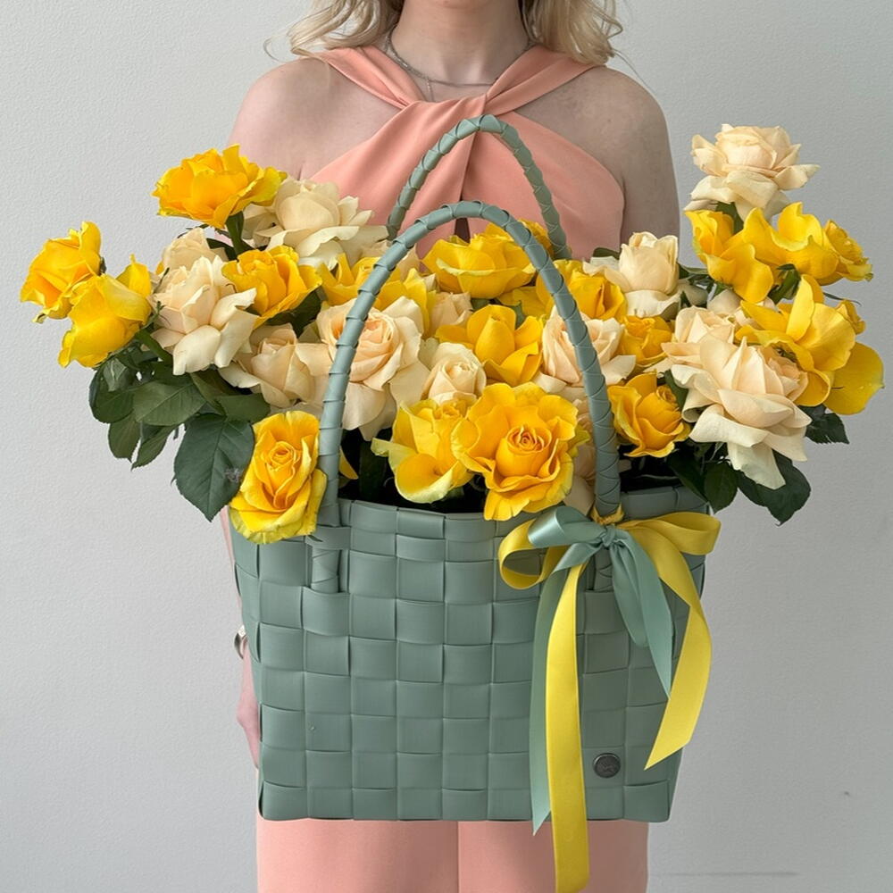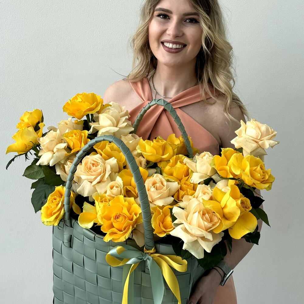 Composition: rose peach - 20, bag - 1, Oasis - 1, rose yellow - 20 Sizes: WIDTH - 45CM; HEIGHT - 50CM; LENGTH - 45CM; (including packaging) Size: 45 x 50 x 45 cm