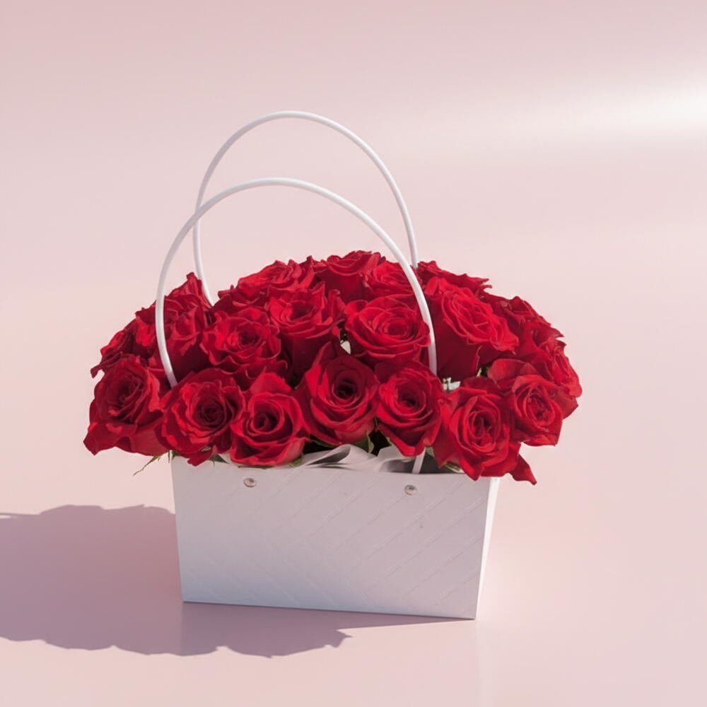 A stunning arrangement of 25 premium red roses elegantly presented in a stylish floral bag, designed to express deep love and admiration. Each rose is hand-selected for rich color and freshness, creating a bold yet refined look. Wrapped with soft greenery and finished with delicate details, this arrangement makes a timeless statement. Perfect for romantic gestures, celebrations, or especially suitable as a birthday gift, it delivers beauty, emotion, and unforgettable charm in one graceful presentation. 🌹