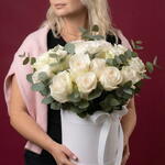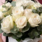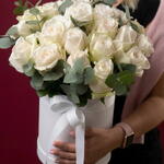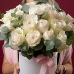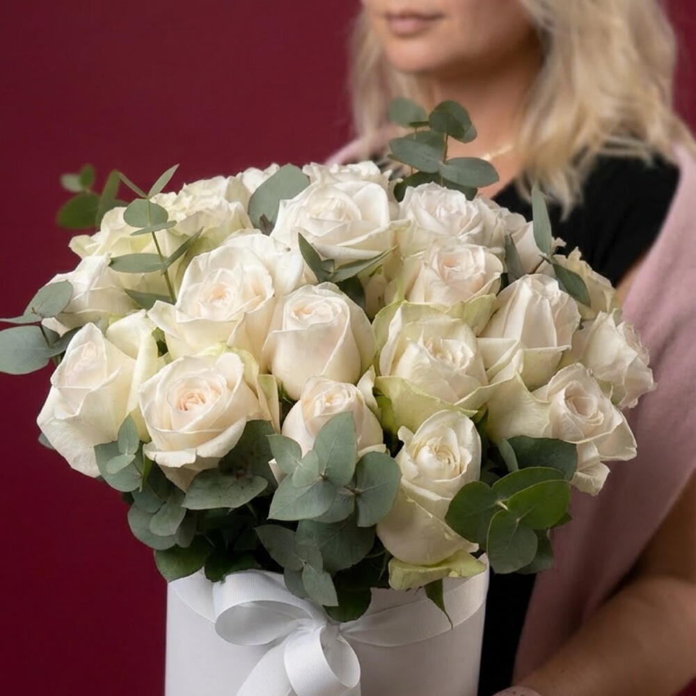 A timeless and elegant flower box featuring luxurious ivory roses accented with fresh eucalyptus foliage. The soft creamy tones of the roses create a refined, classic look, while the natural greenery adds freshness and balance to the composition. Arranged in a round white hat box and finished with a delicate blush pink ribbon, this floral arrangement feels sophisticated, graceful, and effortlessly stylish. Each rose is carefully selected and arranged by a professional florist to ensure long-lasting beauty and a flawless presentation. Perfect for birthdays, anniversaries, weddings, congratulations, expressions of love, gratitude, or as a premium gift “just because.” This flower box is an ideal choice for those who appreciate classic elegance and understated luxury. Delivered with care and attention to detail. A personalized greeting card can be added upon request.