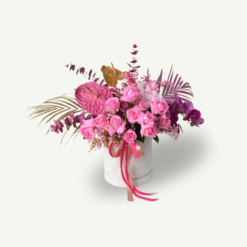 A mixture of 20 pink roses, 1 pink hydrangea, 1 purple orchid stem, pink and gold anthuriums, pink and gold areca leaves, pink eucalyptus, and pink gypsophila gently crafted in a white velvet box for a luxurious and feminine touch.