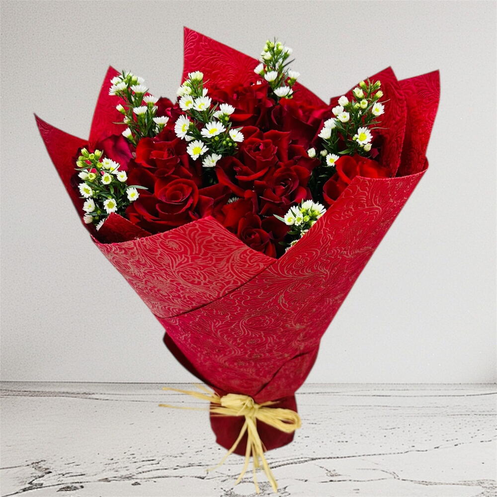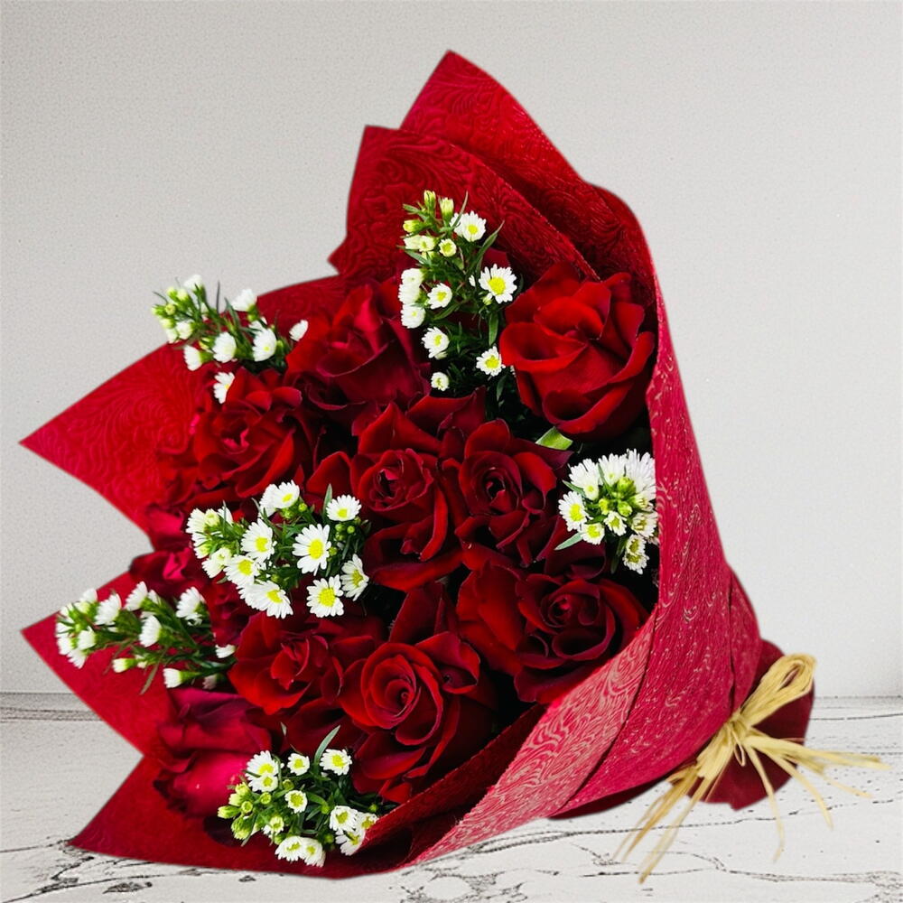 💐 Includes: • 11 Red Roses • 4 Stems Of Babies Breath/Gypsum • Classic Wine Red Colored Wrapping • Creamy Raffia Ribbon • Free Personalized Card (IN ENGLISH) ❤️ Ideal for: Surprise | Anniversary | Gift | Just Because | Special Moments | Love | Any Occasion