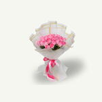 Hand-tied bouquet with 25 fresh pink roses, gently crafted in a trendy wrapping for a soft and elegant expression.
