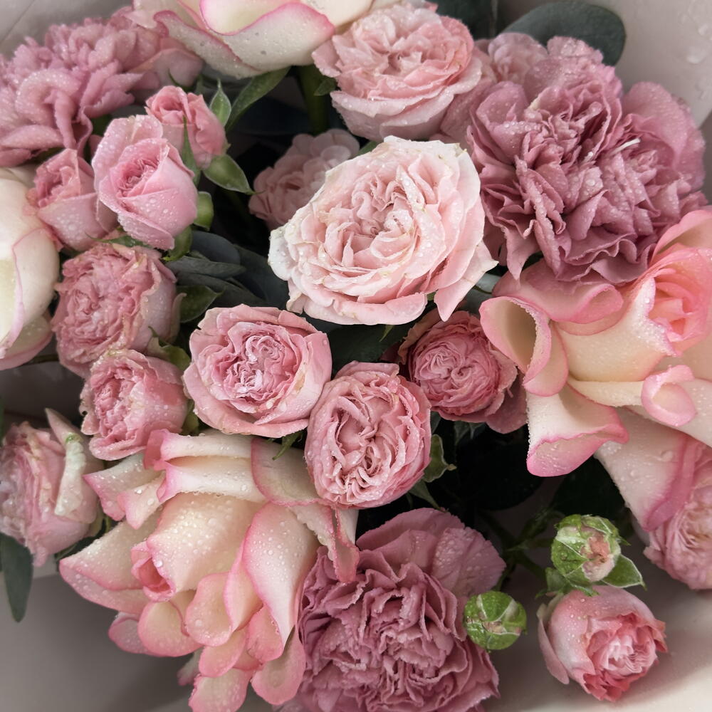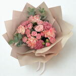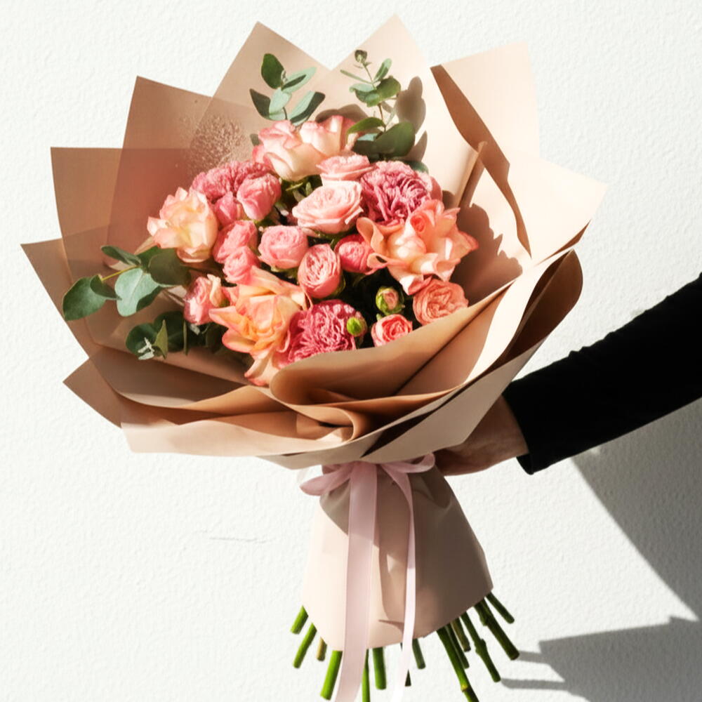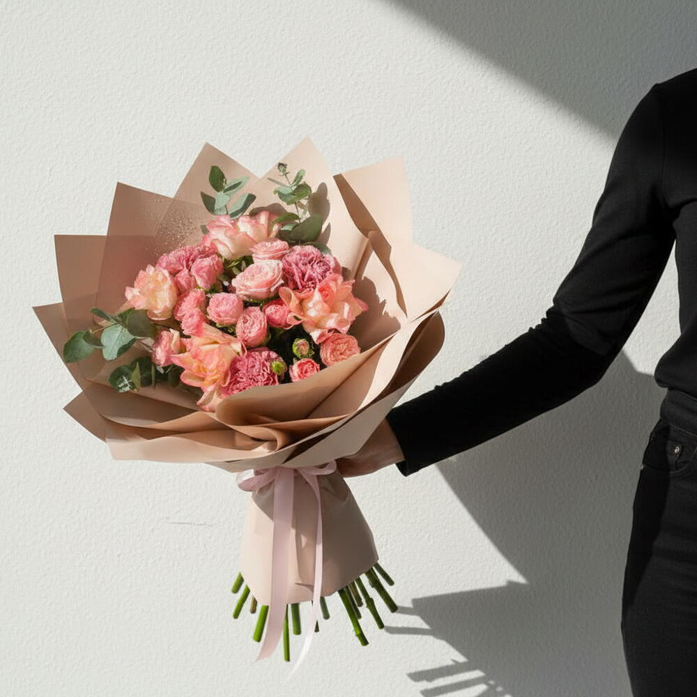 A soft and elegant bouquet crafted with premium pink roses, delicate baby roses, light pink carnations, and fresh eucalyptus. Each stem is thoughtfully selected and wrapped in luxurious nude-toned paper, creating a bouquet that feels modern, romantic, and beautifully refined. The mix of textures—classic roses, ruffled carnations, and aromatic eucalyptus—adds depth, freshness, and a spa-like calm to this stylish arrangement. Designed to express tenderness and heartfelt emotion, this bouquet is perfect for celebrating love, gratitude, and life’s meaningful moments. Perfect For: • Romantic surprises anniversaries • Birthdays heartfelt wishes • Thank-you gestures • “Just because” moments • Mother’s Day personal milestones Hand-crafted by expert florists, each bouquet is made with care to ensure freshness, beauty, and long-lasting charm. Send a touch of soft elegance today.