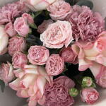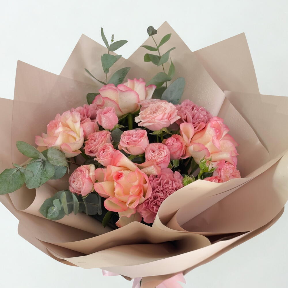 Ribbon - 1 pcs Eucalyptus - 3 pcs Pink rose - 4 pcs Wrapping - 4 pcs pink baby rose - 3 pcs light pink carnation - 3 pcs