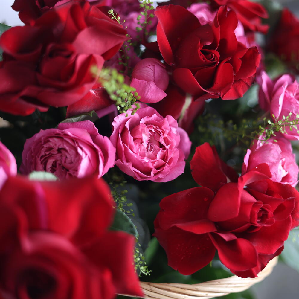 Red rose - 10 pcs Basket - 1 pcs bombastic spray rose - 4 pcs green dragon - lepidium - 3 pcs leather farm leaves - 6 pcs