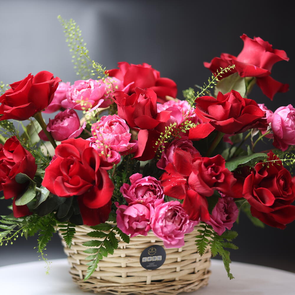 The Rosy Bombshell: A Luxury Red Roses and Bombastic Spray Roses Basket Ignite the flames of romance with our Red Roses and Bombastic Spray Roses Basket, titled “Rosy Bombshell.” This show-stopping arrangement is a masterclass in floral texture, blending 10 classic premium red roses with 4 lush, multi-bloom Bombastic spray roses. Presented in a charming, high-quality gift basket, this Red Roses and Bombastic Spray Roses Basket is designed to express deep love and passion with a modern, voluminous twist. Handcrafted by elite UAE florists, it is the premier choice for those seeking a bold and unforgettable floral statement.