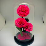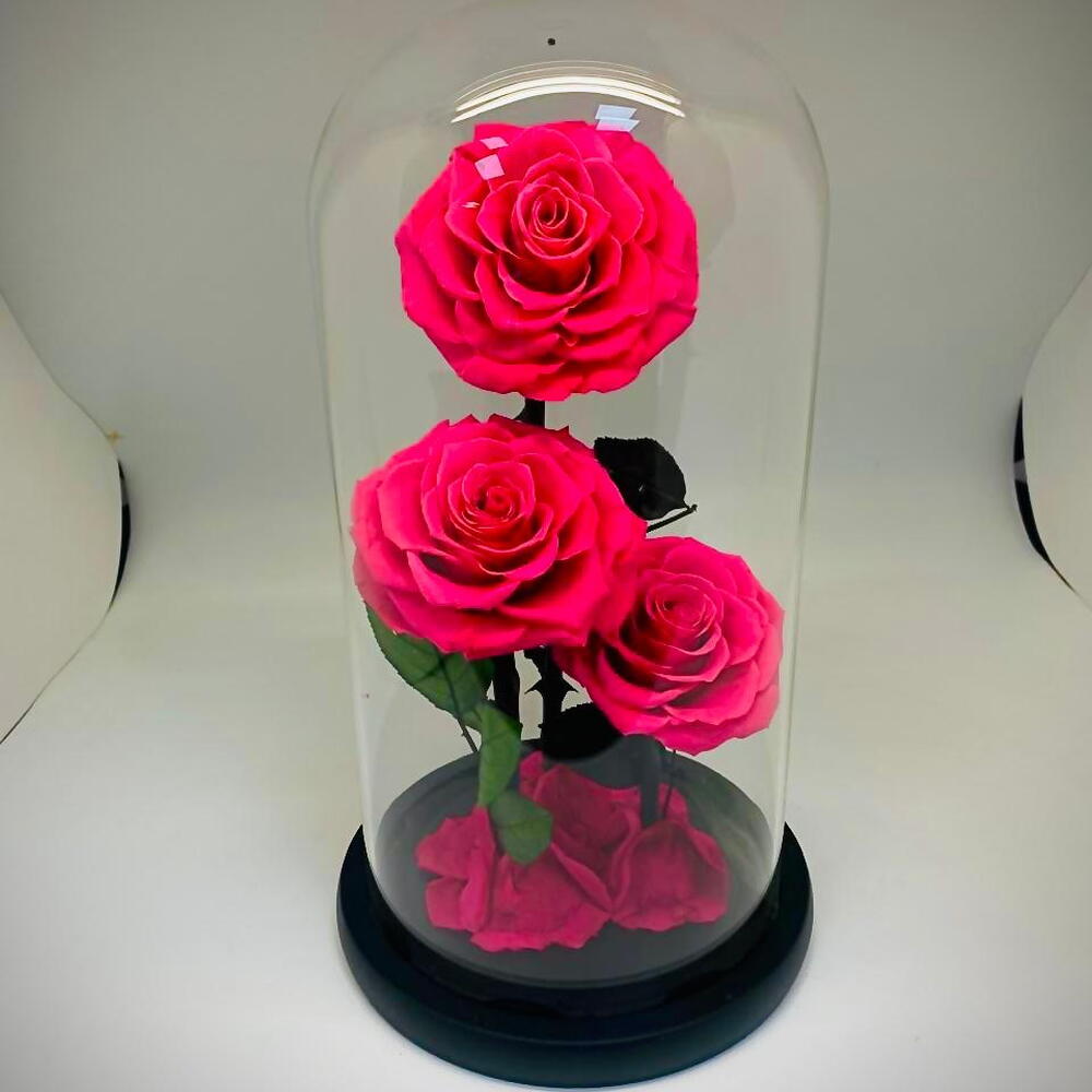 Three head preserved Dark Pink roses, elegantly set inside a glass dome and presented in a black foam luxury box. Comes with a hand-carry bag perfect as a timeless and thoughtful gift.