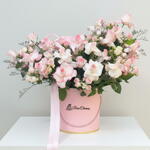 A refined box arrangement of 21 soft pink roses designed for elegant, premium gifting.. graceful arrangement of 21 soft pink roses paired with 6 sweet pink spray roses, artfully nestled in a premium hatbox and finished with an elegant satin ribbon. These pastel blooms whisper admiration, gentle affection, and timeless grace, making the bouquet an ideal gesture for anniversaries, thank‑you gifts, birthdays, or “just because” surprises. Each rose is hand‑selected at peak freshness, ensuring velvety petals and a lingering fragrance that lifts any space. Symbolism: Pink roses signify love, gratitude, and delicate charm. Presentation: Luxe ribbon‑tied box, ready to display—no vase needed. Quality: Farm‑fresh stems cut to order, guaranteeing long‑lasting joy. Perfect For: Celebrating milestones, uplifting friends, or brightening home décor. Send a boxful of warmth and elegance—because life’s beautiful moments deserve petals that speak from the heart.
