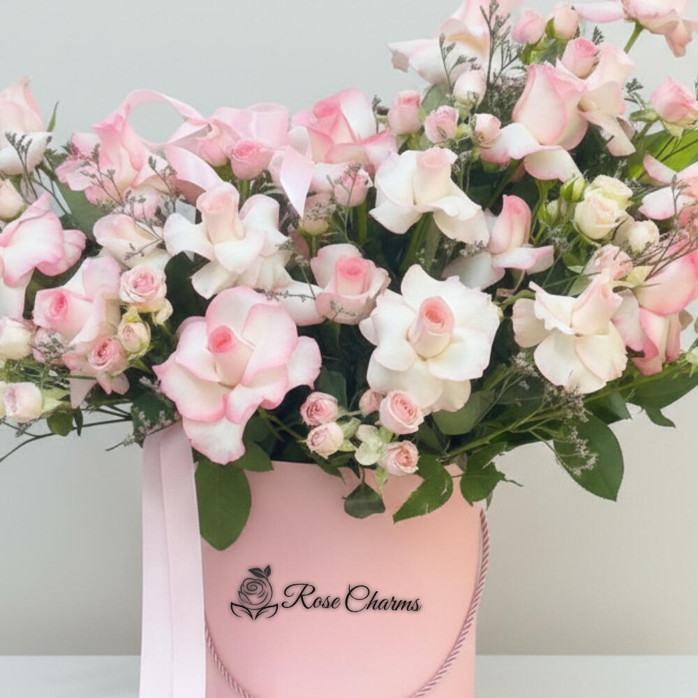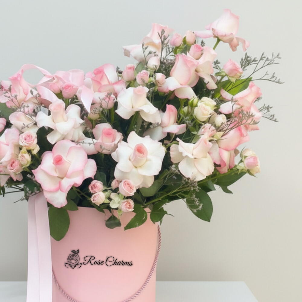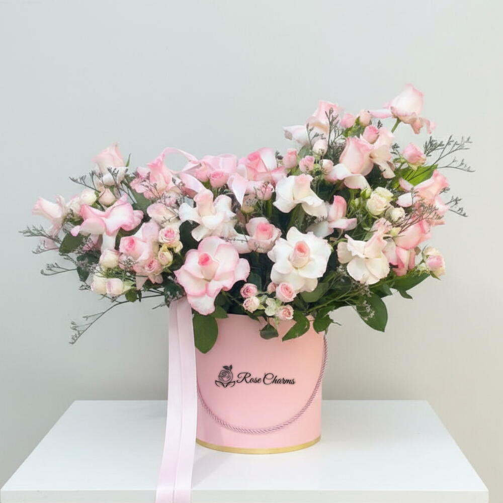 A refined box arrangement of 21 soft pink roses designed for elegant, premium gifting.. graceful arrangement of 21 soft pink roses paired with 6 sweet pink spray roses, artfully nestled in a premium hatbox and finished with an elegant satin ribbon. These pastel blooms whisper admiration, gentle affection, and timeless grace, making the bouquet an ideal gesture for anniversaries, thank‑you gifts, birthdays, or “just because” surprises. Each rose is hand‑selected at peak freshness, ensuring velvety petals and a lingering fragrance that lifts any space. Symbolism: Pink roses signify love, gratitude, and delicate charm. Presentation: Luxe ribbon‑tied box, ready to display—no vase needed. Quality: Farm‑fresh stems cut to order, guaranteeing long‑lasting joy. Perfect For: Celebrating milestones, uplifting friends, or brightening home décor. Send a boxful of warmth and elegance—because life’s beautiful moments deserve petals that speak from the heart.