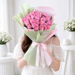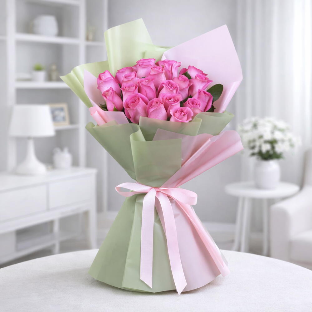 • 21 Pink Rose Stems • Beautifully Wrapped with Pink Green Wrapping • Tied with Pink Ribbon Bow