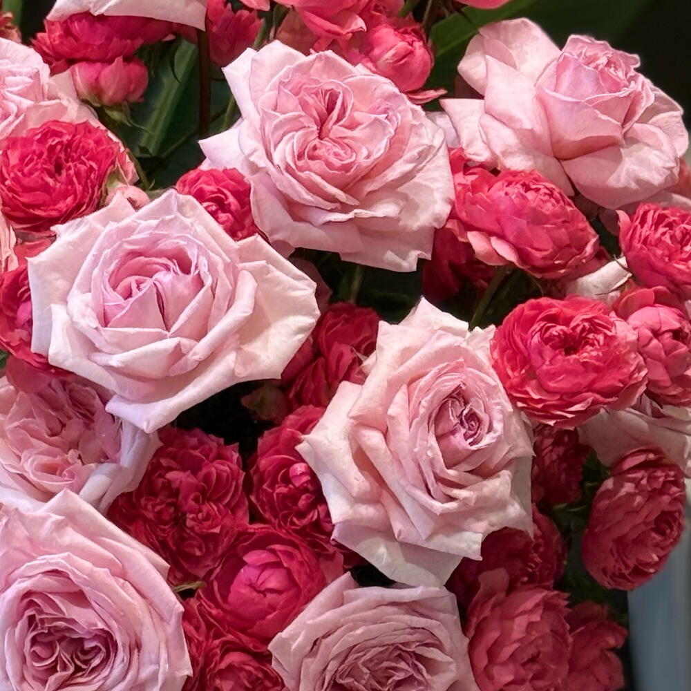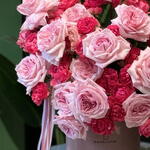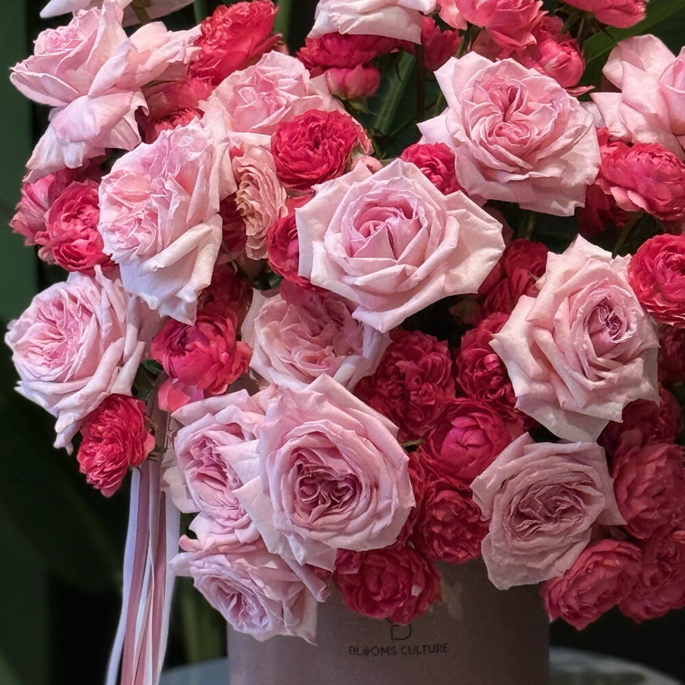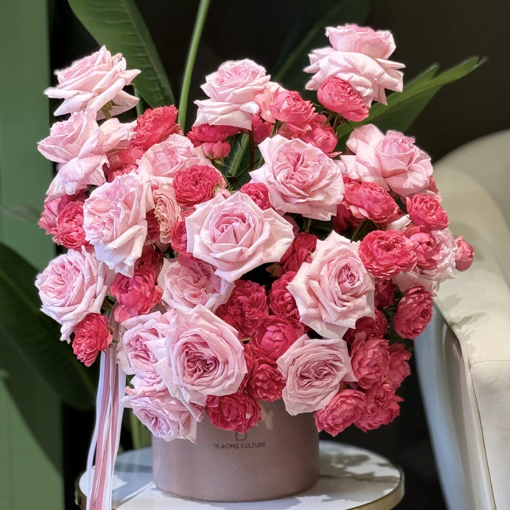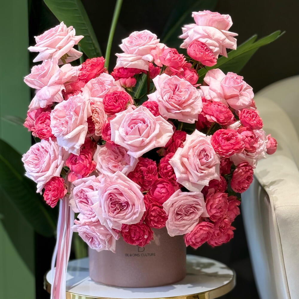 A breathtaking blend of soft blush pink roses and vibrant deep-pink garden spray roses, artfully arranged in a premium velvet hatbox. This bouquet celebrates pure romance and elegance, with each bloom showcasing lush, layered petals and a naturally luxurious texture. Finished with flowing pink ribbons, Rosy Harmony Luxe Box is perfect for birthdays, anniversaries, or any moment that deserves a grand, graceful expression of love.